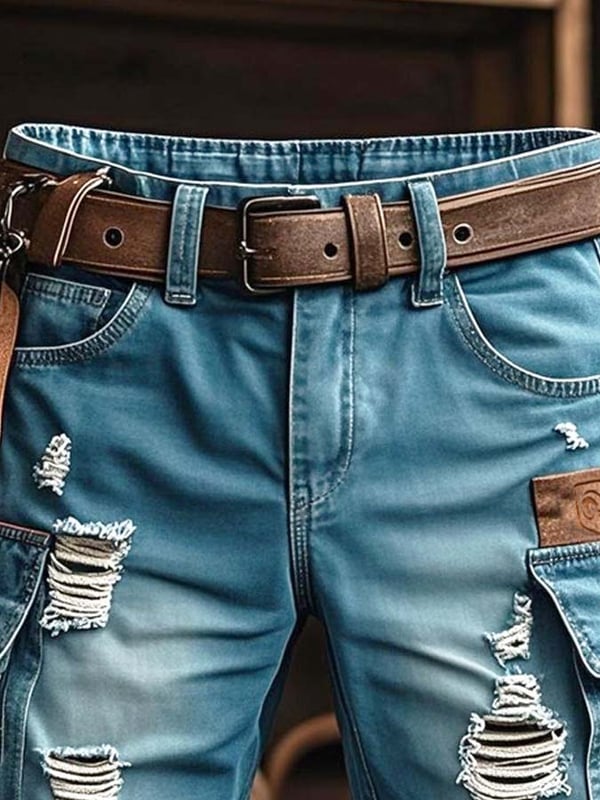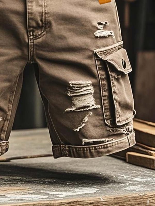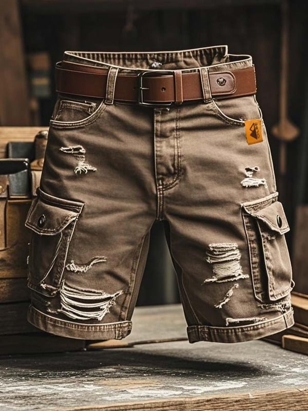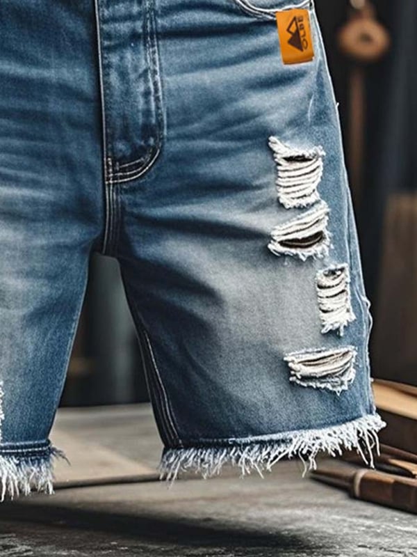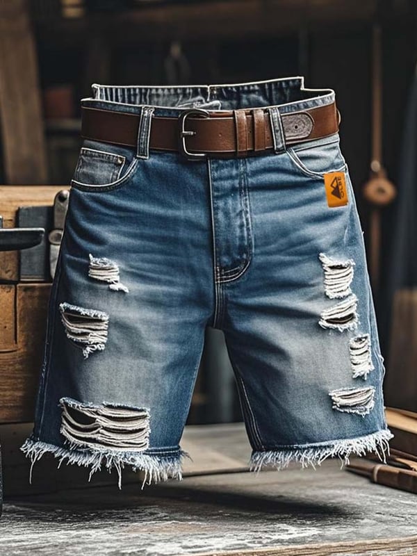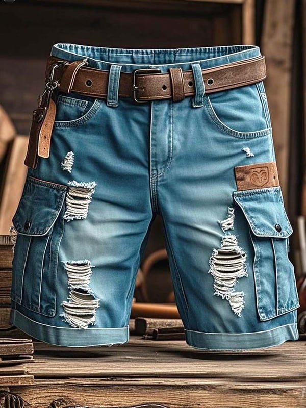 Herren Vintage Outdoor Funktions-Shorts Aus Zerrissenem Denim
