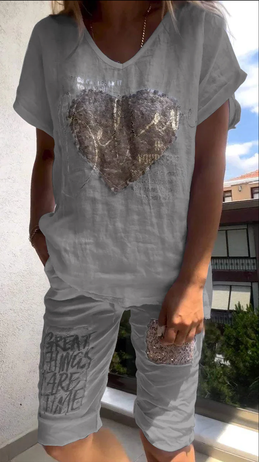 Varessa – Lässiger Zweiteiler mit V-Ausschnitt und Goldprägung
