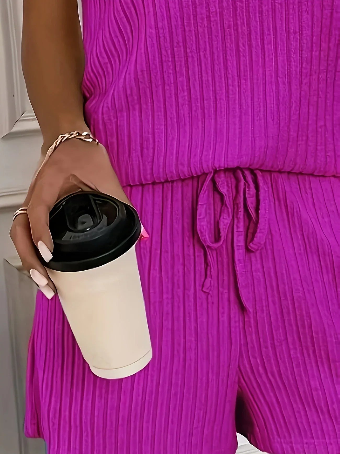 Vielseitige Styling-Möglichkeiten: Tragen Sie das Set als Kombi für einen abgestimmten Schau oder kombinieren Sie das Oberteil oder die Shorts mit anderen Basics aus Ihrem Kleiderschrank. Es passt gut zu Sandalen, Sneakers oder sogar einer leichten Jacke. Ob am Strand oder beim Brunch, es ist mühelos stilvoll.