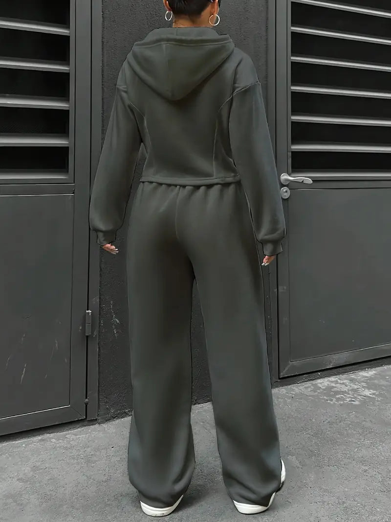 Schmeichelhafte Passform: Der taillierte und dennoch lockere Schnitt des Hoodies und der Hose sorgt für eine ausgewogene Silhouette. Er formt den Körper sanft, ohne zu eng anzuliegen, und bietet sowohl Stil als auch Komfort. Der verstellbare Bund und der weiche Fall unterstreichen die schmeichelhafte Passform für verschiedene Figurtypen.